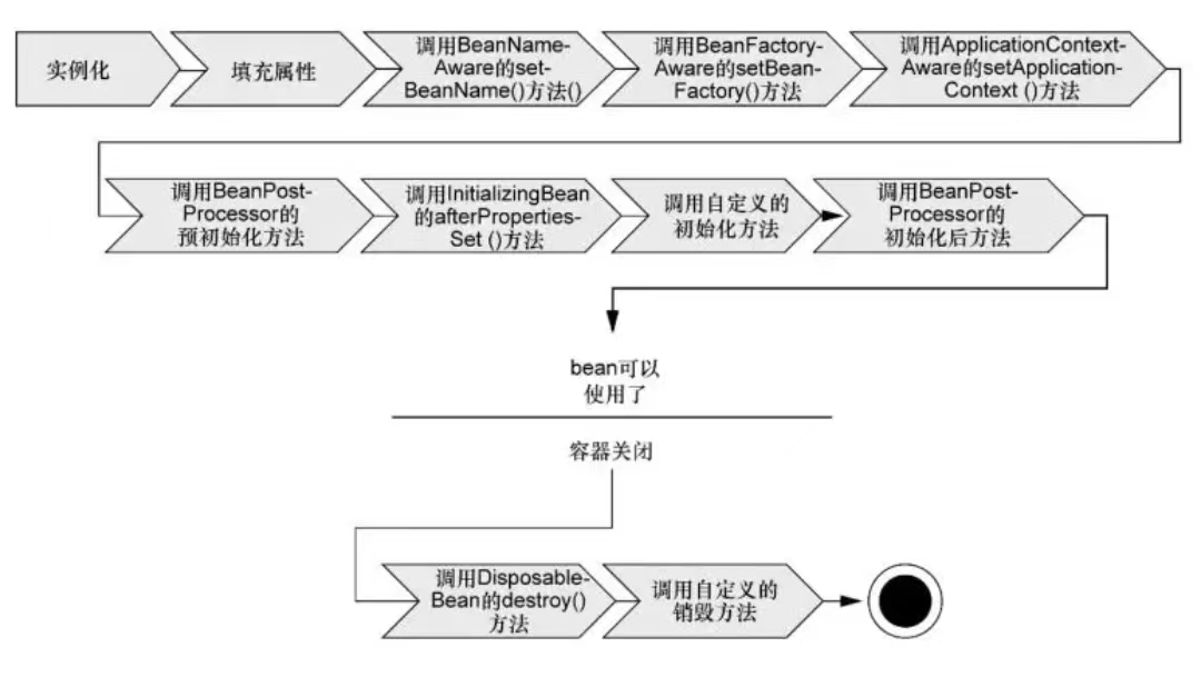 被spring管理的一个bean从创建到销毁的过程,一般分为:实例化→属性注入→初始化→使用→销毁五大阶段,初始化阶段再细分为 Aware、前置处理、自定义初始化、后置处理