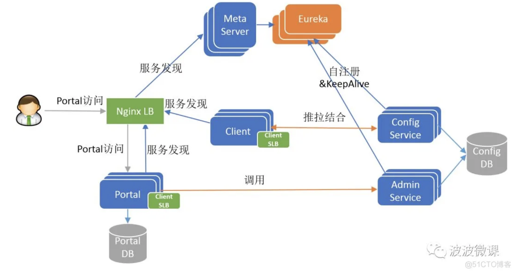 - Portal通过域名访问MetaServer获取AdminService的地址列表- Client通过域名访问MetaServer获取ConfigService的地址列表
